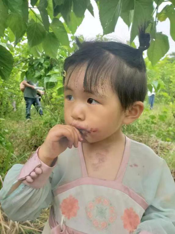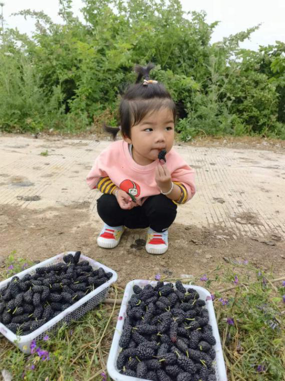 经过一段颠簸的水泥路我们终于到达目的地,首先我们按照每组划分,有拿大筐的,有选小筐的,大家积极踊跃的投入到采摘活动中,只见一群人进入桑田犹如进入浩瀚的海洋,真有点“林深不知处,只在此山中”的感觉。偶尔在田间地头遇到几个小朋友,她们一个个手上嘴上都沾满了桑葚的果汁,一个个红得发紫,一阵微风飘过,吹乱了她披在前额的长发,犹如画中人一般。此时我真不知道是古灵精怪,还是冰雪聪明,我想不管怎么样她们采摘到了属于自己的胜利果实,那是每个小朋友自己的劳动的成果,我不知道她们是否开心,但我却看到她们嘴上挂着淡淡的微笑。